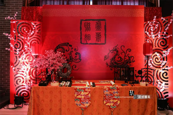 5年前我们为新郎的哥哥举办了盛大的汉式婚礼,那场也是当年规模最大,我们几乎片刻不停地忙了2个月。但是这次,从下单到婚礼当天,只有20天左右的时间!前后还有其他2场大活动夹击(婚礼第2天就是一场大型集体成人礼)。