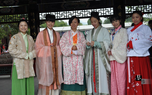 (左起)广州汉服协会会长凤凰传说、广州汉服协会志愿者锦瑟、琴瑟华夏礼仪策划兼广州汉服协会副会长蕾蕾老师、北京雅韵华章品牌服饰艺术总监翾儿、福建汉服天下小虎、广州汉服协会志愿者西梁梦玉。