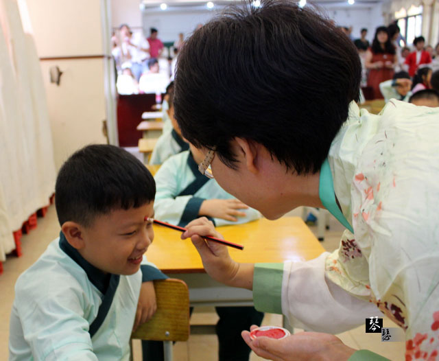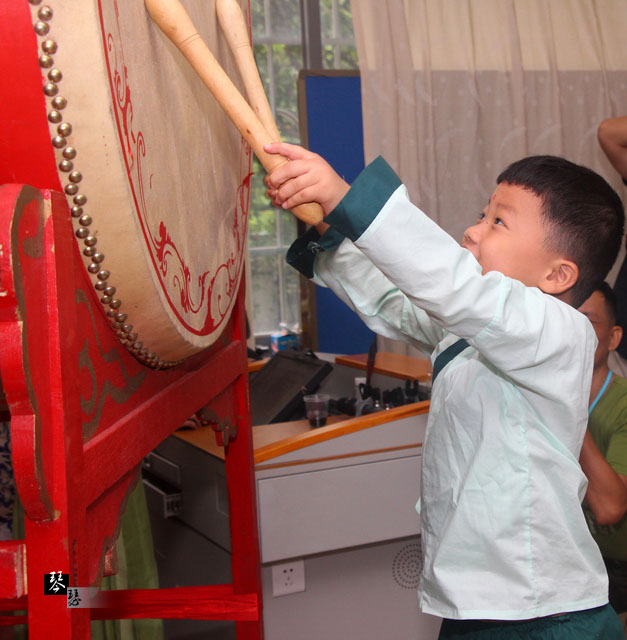 开笔礼包括正衣冠、拜圣贤、朱砂启智,执笔描红,击鼓明志等环节。