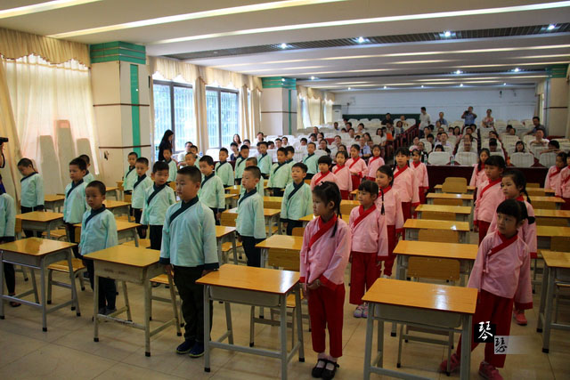 8:00,仪式正式开始,孩子们身穿汉服,在老师的带领下,开始了开笔礼的仪式。