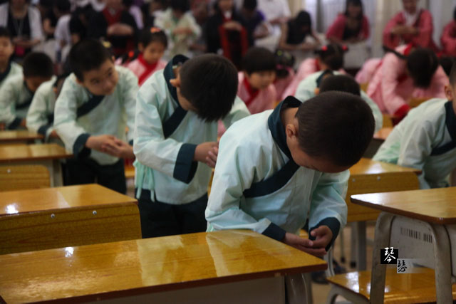 首先,司仪蕾蕾老师引导孩子们进行正衣冠环节。“同学们,我们今天身穿的是我们汉民族的传统服装,叫汉服,我们今天穿的这套汉服,前面,后面,都可以看到一条缝,它叫中缝,象征做人要中正平和,所以大家要检查自已衣服的中缝有没有对准中间,对好了就是穿正了!孩子们一听都非常兴奋的认真检查起来,把衣服拉得端端正正。