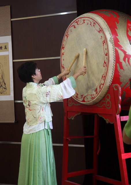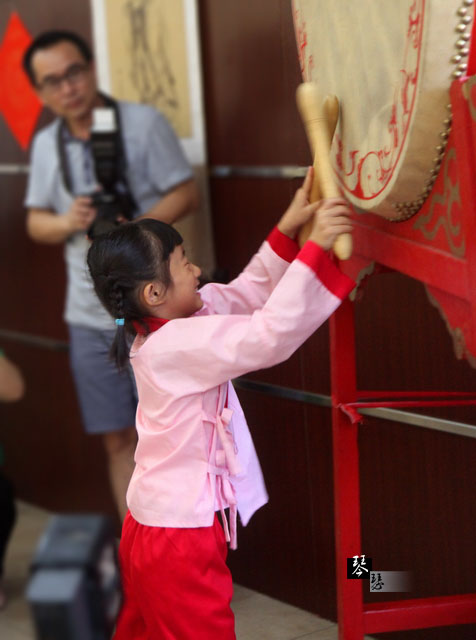 击鼓鸣志,孩子们依次走到大鼓前敲击,敲击时,孩子在心里默默地说出自己的理想和志向;