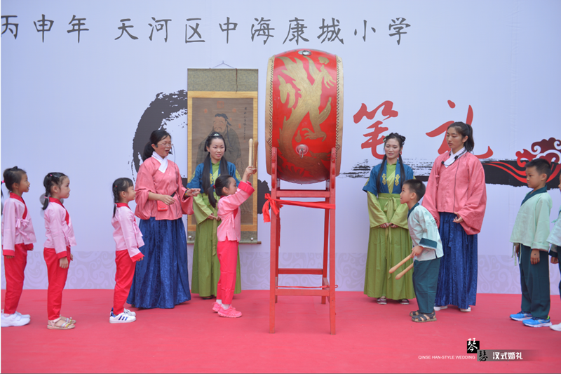 仪式在中海康城小学的中心操场举行,全体师生身穿汉服,静坐舞台前,翘首企盼。15:30,一曲古琴拉开了序幕。蕾蕾老师介绍出席嘉宾。随后,同样身穿汉服的郑建聪校长,登上舞台庄严宣布:“开笔礼正式开始。”
