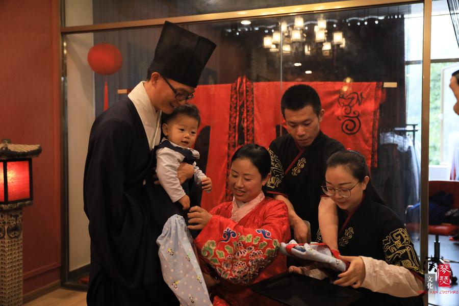 随后,由宝宝的爸爸妈妈为他换上新衣服,这预示着他暂新人生的开始。