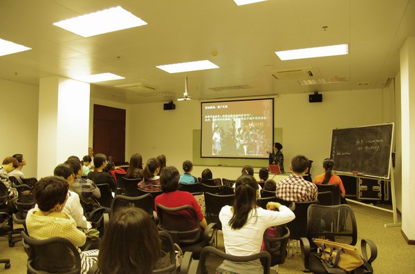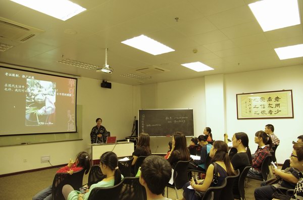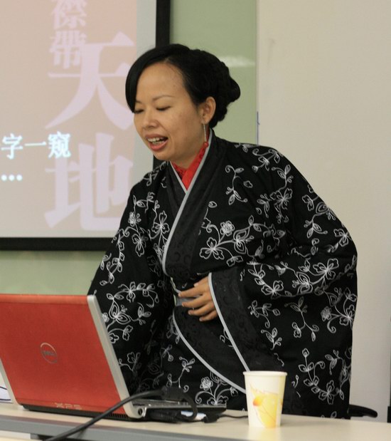 2012年11月10日,中华吟诵学会广东中心培训课上,来自广州汉服协会宣传部的蕾蕾老师为大家上了一节汉服知识普及课。来自全国各地的吟诵爱好者认真倾听了蕾蕾老师的讲座。