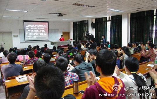 2012年12月15日,一场名为《汉服及其迷人的文化》的知识讲座在华南师范大学主校区举行。这场汉服讲座由广州汉服协会与华南师范大学教科院研究生会联合组织的公益活动,分汉服讲座、文艺表演和汉服试穿三个内容。