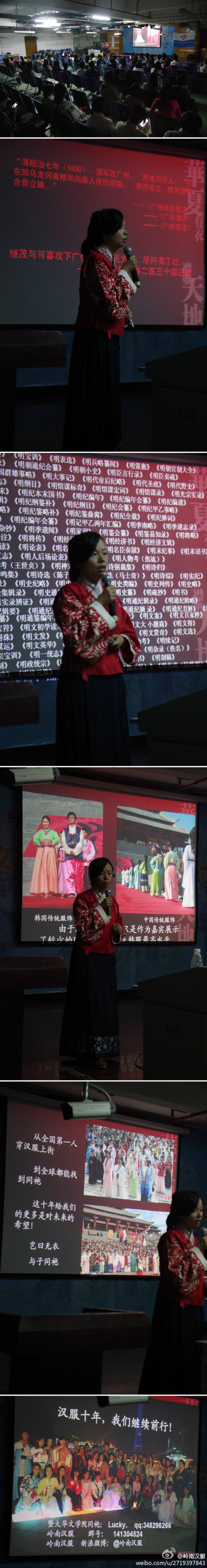 汉服十年之际、2013年11月23日晚 岭南汉服副会长蕾蕾老师受邀到暨南大学华文学院作汉服知识讲座。这次蕾蕾老师加入了一些新内容,特别是针对汉服文化周官网和中华礼乐大会增加了图文展示。当讲述汉服消亡痛史,现场听众禁不住流泪;当展示中韩服饰对比换上汉服,现场爆发一阵扬眉吐气的掌声!
