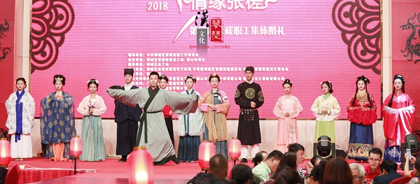 在张槎西化里饮食文化城举办了“囍结连理·情缘张槎”第四届张槎职工集体婚礼。