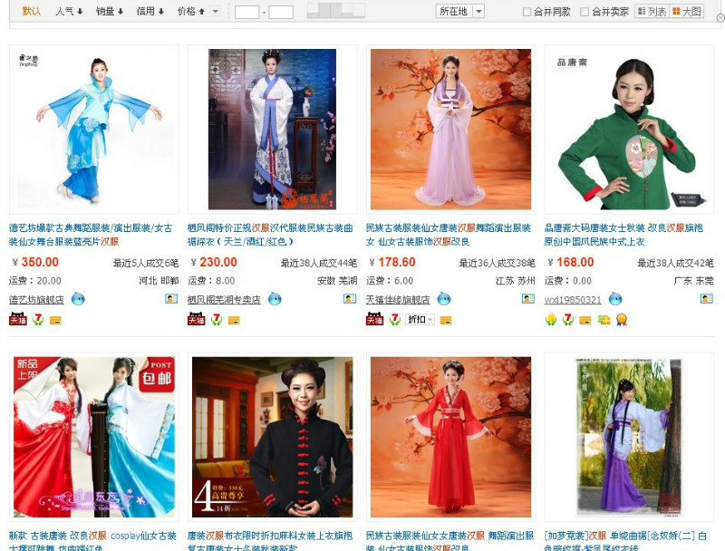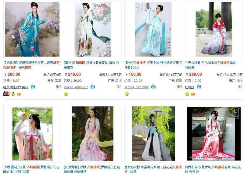 为了提高被搜中的机率,淘宝卖家们拼命增加自己商品中的关键字。所以“汉服”这个词他们也毫不客气地拿来用,上面是我随机打了“汉服”二字搜出的图片,前八张里面只有第8张是如梦霓裳家的,形制相对正确的汉服(其实小曲还是有争议的,但比别的好点)。其它都是千奇百怪的影楼装,或连影楼装都不是。