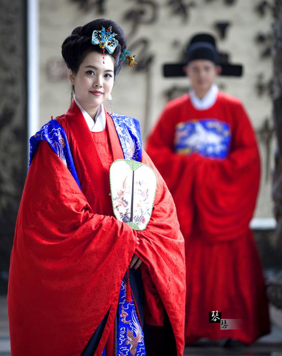明风婚服不象唐风婚服一样需要以袖口和领口露出繁杂的层次来体现美感,却仍然要穿着多层,是因为需要通过里面的服装把外面的礼服撑起,体现出一种端庄、雍容、高贵的气度。明朝时期,朝鲜是中华的附属国,韩服就继承并体现了这种端庄、雍容的风格。
