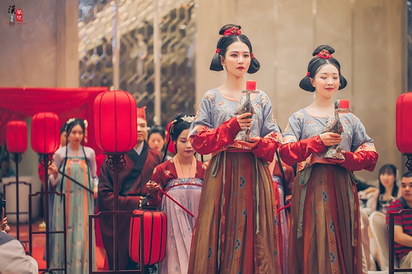 大唐盛世,华丽浪漫,红男绿女就是指新郎穿着红色的婚服,新娘则穿着青绿色系的婚服,当然,现在也有很多其他色彩的唐风婚服也十分受欢迎。