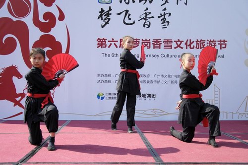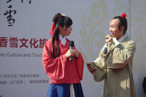 喜庆搞笑的粤剧对唱节目《唐伯虎点秋香——求神》拉开了汉服宣传活动的帷幕。戏剧是中国的国粹,而岭南地区以粤剧最受欢迎。