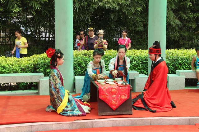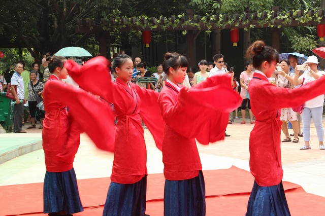 另外,由广州琴瑟汉婚主要承办的乞巧文化节汉文化演出,每天上下午各一场在园内演出受到热烈欢迎。精美的服饰,曼妙的舞姿,震撼人心的婚礼,刚劲有力的武术,让人目不暇接,赢得全场喝彩。夹菜、绣锦囊、汉服试穿等等互动游戏环节更是让现场变得热闹,即便骄阳似火也无法阻挡游客朋友想要体验一把七夕佳节的热情。